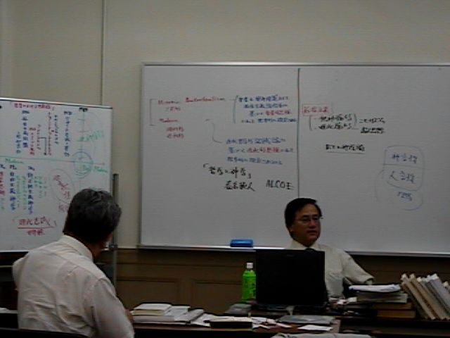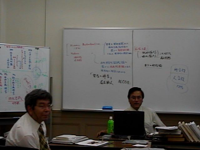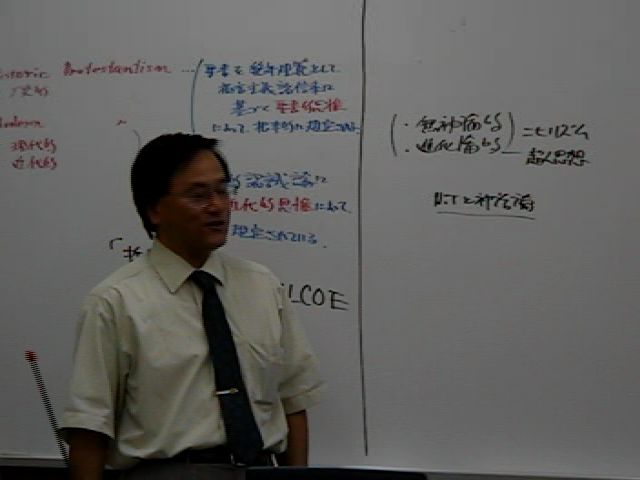 中央芝生を取り囲むように作られた楕円形の通路は、友人とよく散策した道筋です。楕円には、ふたつの中心がありまして、「キリストの神・人二性一人格論」における神性と人性をあらわし、アンテオケ学派とアレキサンドリア学派の緊張と対話のポイントでもありました。今回の特別講義のポイントのひとつに「聖書の神言性と人言性」があります。このポイントは、福音派とリベラル派の緊張と対話のポイントでもあります。人言性が「罪・汚れから無関係であったキリストの受肉」のように、聖書もまたその類比の中で考えられうるのかというポイントです。ホワイトボードの板書をご覧になるときに考えてみてください。 |